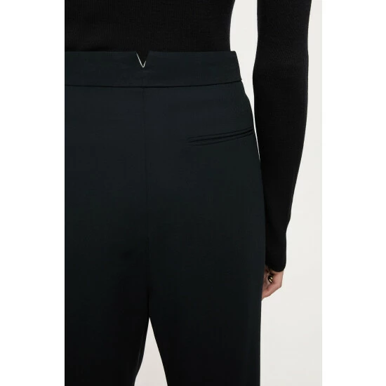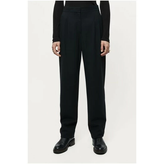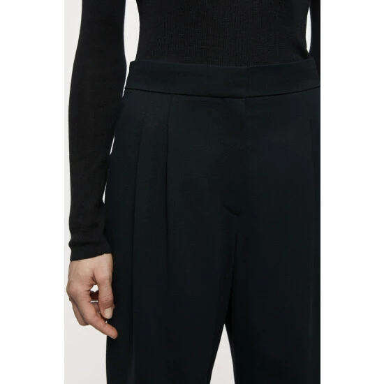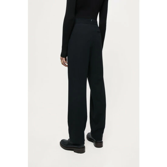 Relaxed pleat front trouser in soft wool with a fluid twill weave. Designed with a wide leg and tailored waistband, fly front with concealed hook and bar closure. Features practical side and back pockets. Style with a leather blazer or as a suit.