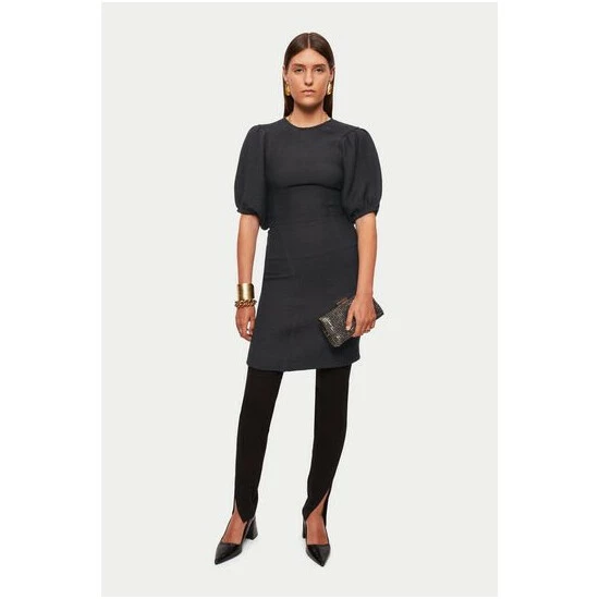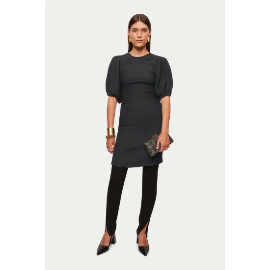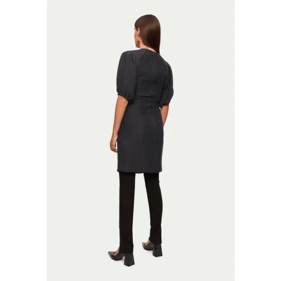 This chic little mini dress, a new silhouette for the season, is cut in a tactile textured viscose crepe. The fabric has a lovely body and structure that is expemplified in the sculptural shape of the sleeves. Flattering round neckline, pleat detail at the shoulders and slimming front body seaming. Metal feature zip at the centre back. Available in multiple colours.