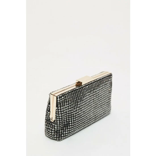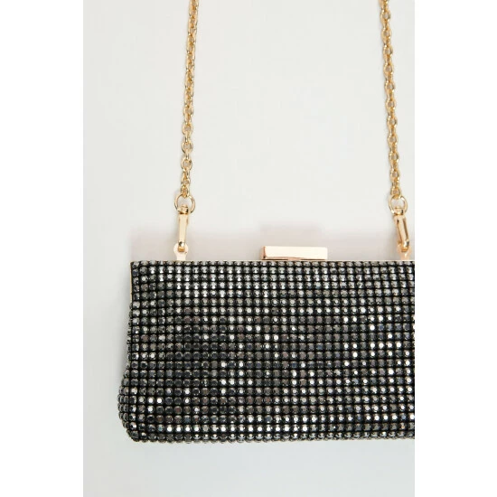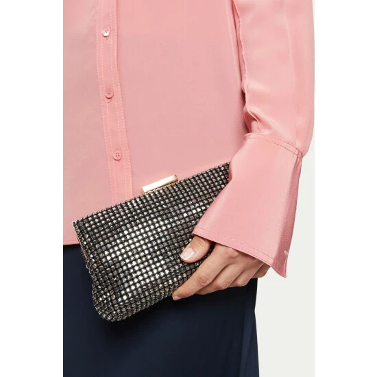 Crystal evening bag crafted from smoke coloured crystal mesh which allows for a soft structure, enclosed in a silver metal frame with a clasp closure and lined with satin feel fabric. This clutch perfectly fits your phone and essentials for any event. Finished with a detachable chain strap, wear yours on the shoulder or carried in hand for the ideal evening look.
