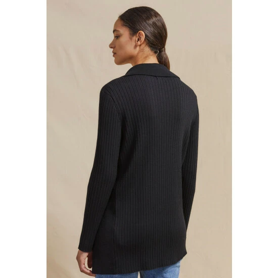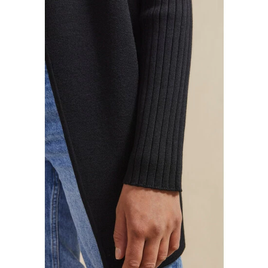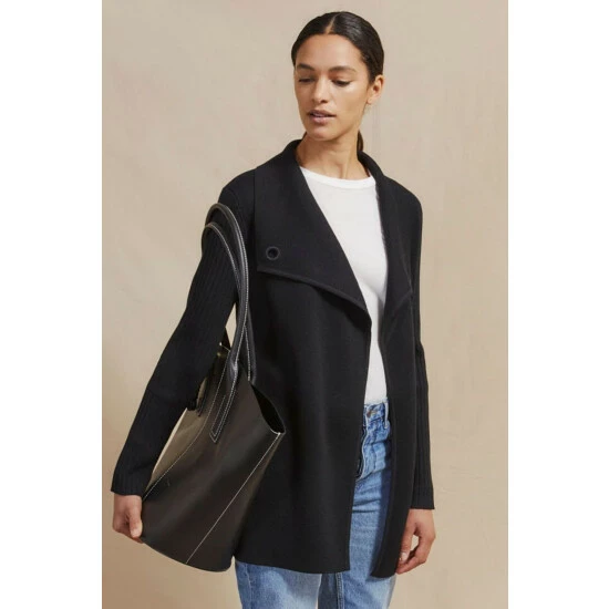 Milano knit longline cardigan with slim sleeves and softly draped collar. Featuring our signature ring and bar fastening this open fronted design can be closed at the neck or just left to sit open. The softly structured milano stitch of the front plays against the rib on the sleeves and back giving texture to this versatile piece. Wear yours from day til dusk over everything from denim and tailoring to dresses and skirts.