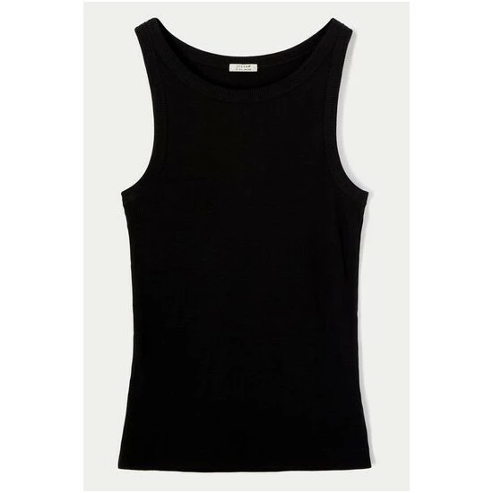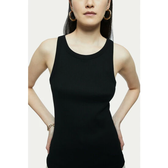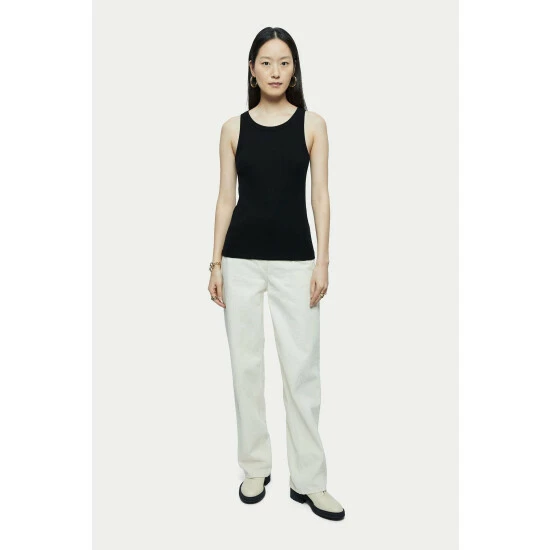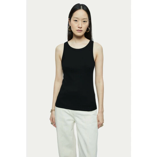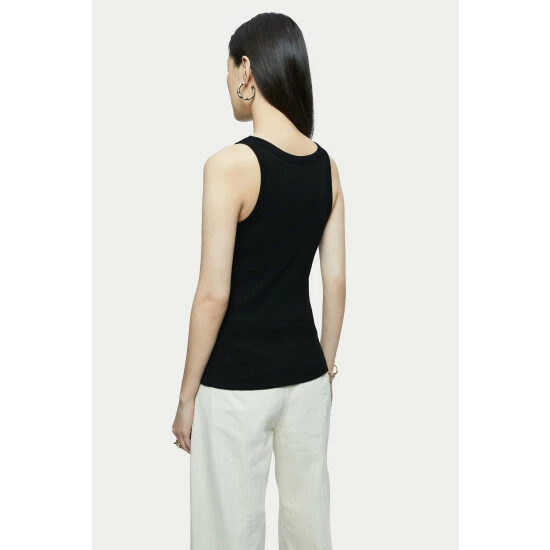 Ribbed tank made from organic cotton jersey. Cut with a slim fit and slightly cutaway armholes to give a flattering line at the shoulders while still providing coverage for bra straps. This jersey style is designed for effortless layering. Wear with wide tailored trousers and a relaxed blazer or use it to underpin this seasons chunky knits.