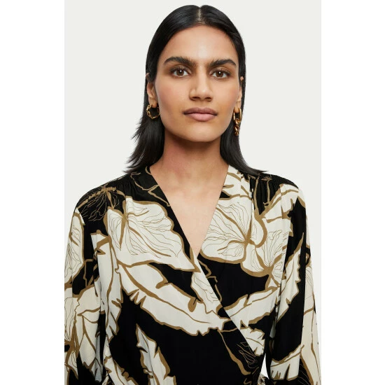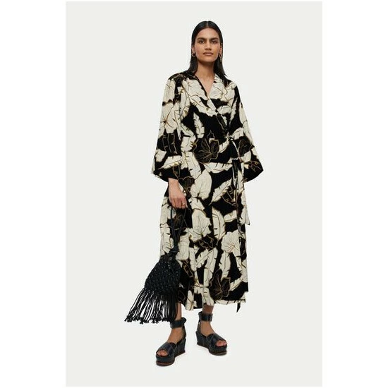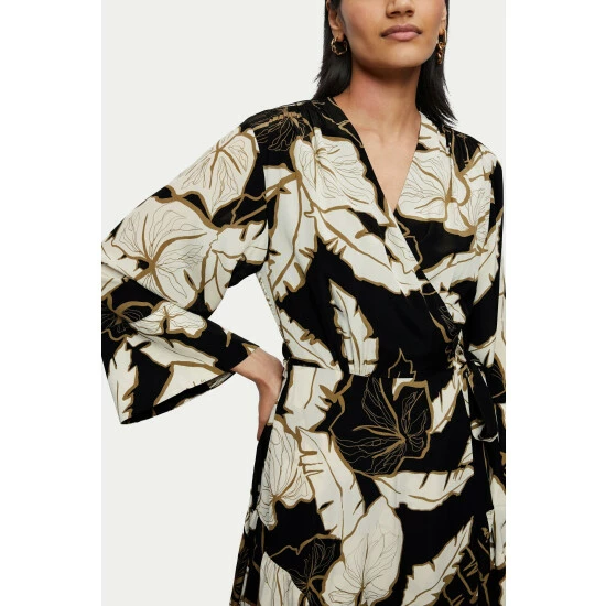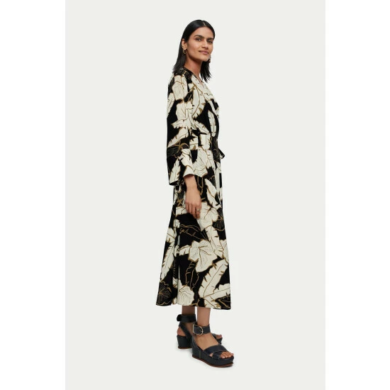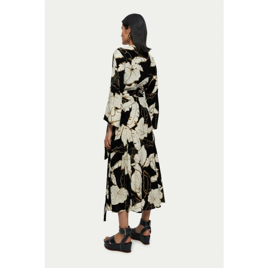 Beautiful midi wrap dress in their Palm Leaf printed on silk. Designed with a wrap front, belted waist and kimono sleeves. Features smocking detail on shoulder and gathering across the godet skirt. The perfect summer occasion dress.