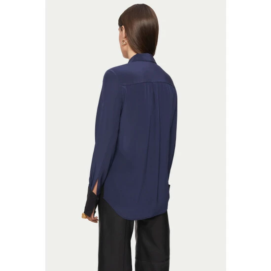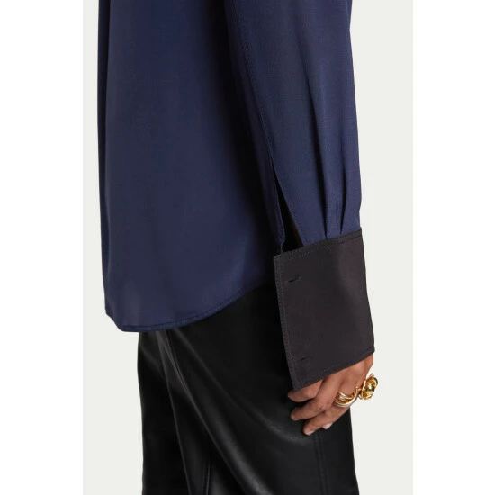 A twist on our best-selling pure silk shirt, we have updated this season with contrast colour cuffs. This shirt has twin needle stitch details, button to neck placket with matching mother of pearl buttons, back yoke and feminine shaped hem. Tuck into tailoring or wear more casually with denim or relaxed tailored trousers.