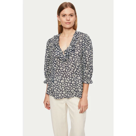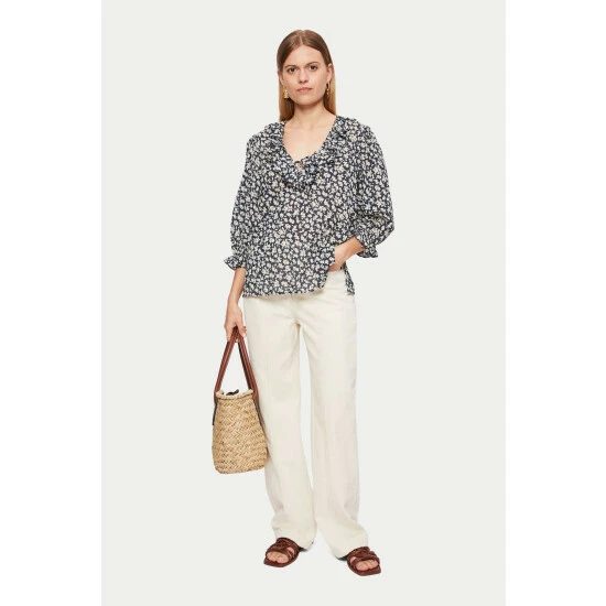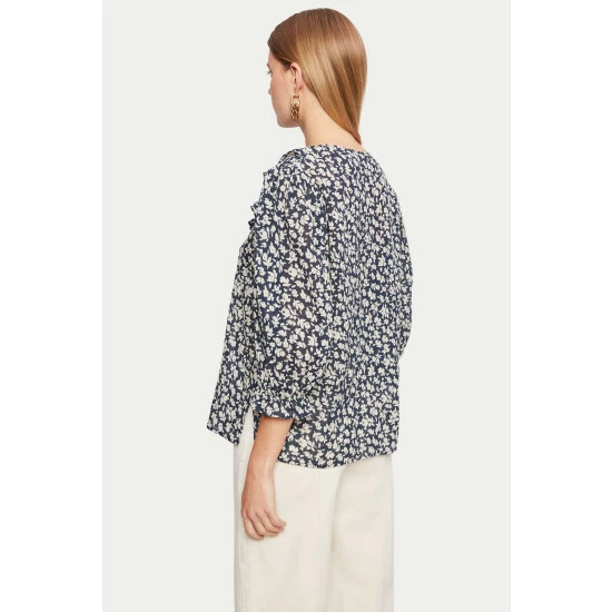 Stylish ruffle top in our cottage ditsy print on soft cotton with a crinkle weave. Features a V-neckline with ruffle details, ¾ length sleeves with elastic cuffs and a square hem with side splits.