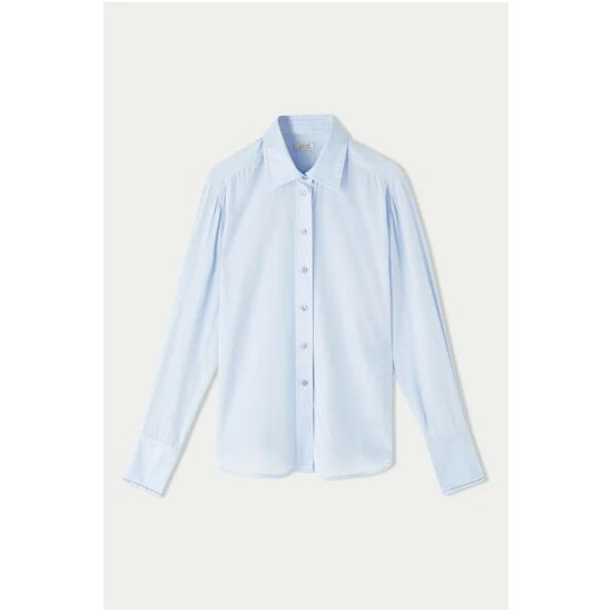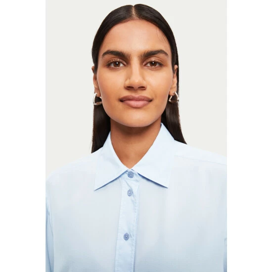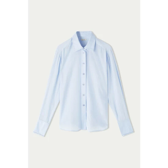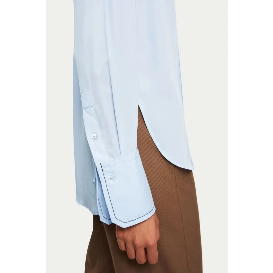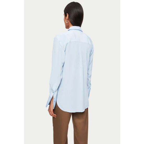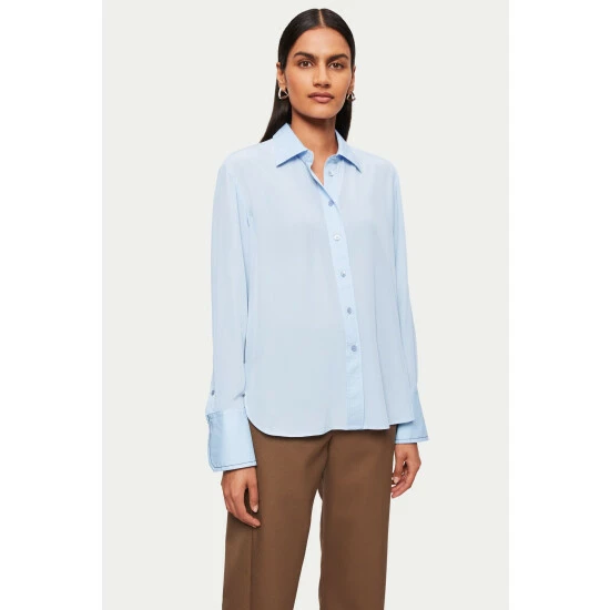 A relaxed shirt cut in luxe silk habotai with contrast cotton poplin cuffs, collar and placket with stitch detailing throughout. Easy fitting in shape, wear french tucked into denim or tailoring. Features include deep buttoned cuffs and a buttoned placket with mother of pearl buttons. Complete with back yoke, and slightly dropped shoulders.
