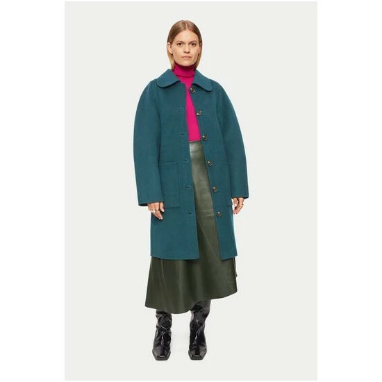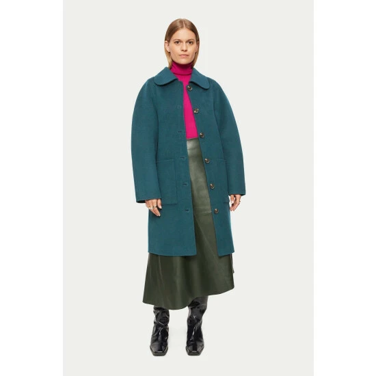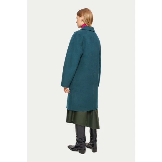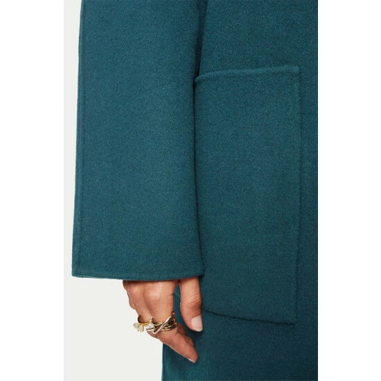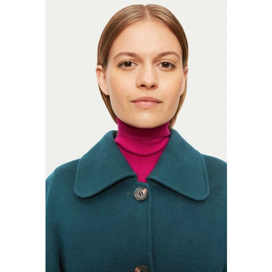 Luxury double faced wool coat in a rich shade of teal. Jigsaw’s double-faced style is constructed by sewing two pieces of the same cloth together with invisible internal threads, making it look like one piece. It is a highly technical, time consuming and intricate process. Created in house, we have cut our pattern with a feminine collar and voluminous sculptured sleeve allowing this seasons chunky knits to fit through, with contrast buttons and feature patch pockets.