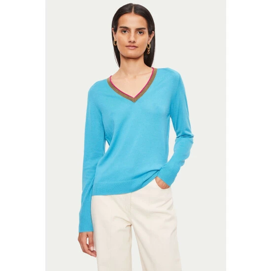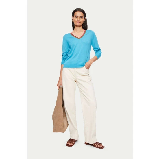 Merino V-neck jumper. Made from ethical ZQ Merino Wool. Knitted on a fine gauge machine for a refined lightweight finish. Detailed with contrast neckline and saddle shoulder. Regular fit and slightly cropped length. Perfect with jeans or layered under tailoring.