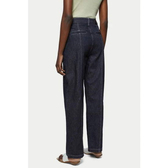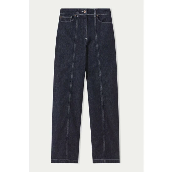 Authentic 5 pocket detail loose leg jean in our ethically sourced rich indigo denim. A tailored regular rise, with straight loose leg and contrast ecru top stitched vertical front and back leg seams. An instant classic.