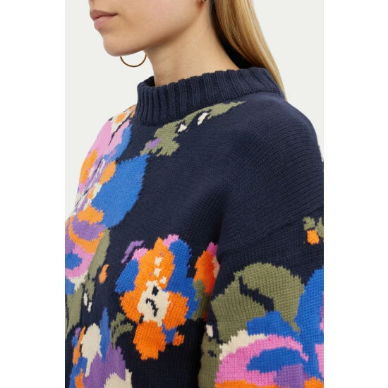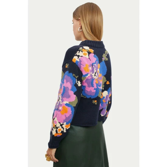Cotton intarsia jumper featuring a stunning wild rose pattern. Designed with external seam details and rib trim at the neck. The relaxed fit is enhanced with drop shoulders and balloon sleeves. Wear this standout piece with denim or tailoring.