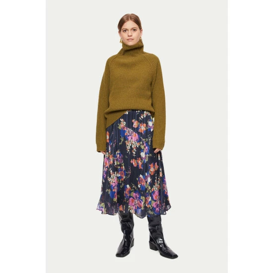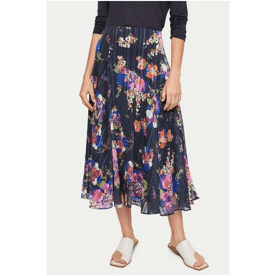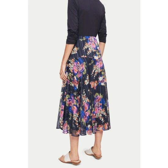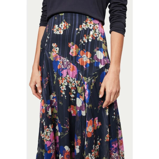 A unique, in-house designed wild rose, printed onto a textured self-stripe fabric base. Midi in length and slightly asymmetric in hemline with feminine godets, this skirt has a great ‘swish’. Invisible side zip. Layer with beautiful cashmere knits and boots come the autumn.