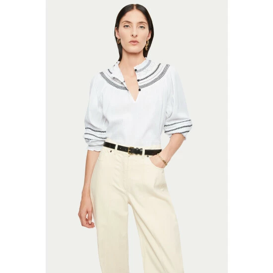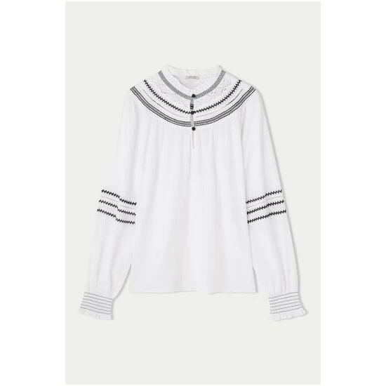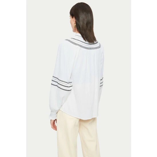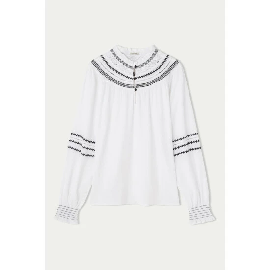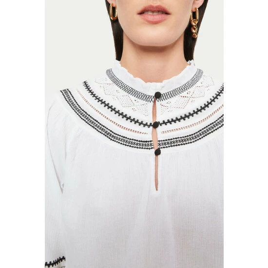 Long sleeve top in soft cotton with a crinkle weave. Designed with embroidery detailing. Features an open neckline with button fastening, voluminous sleeves, smocked cuffs and side splits.