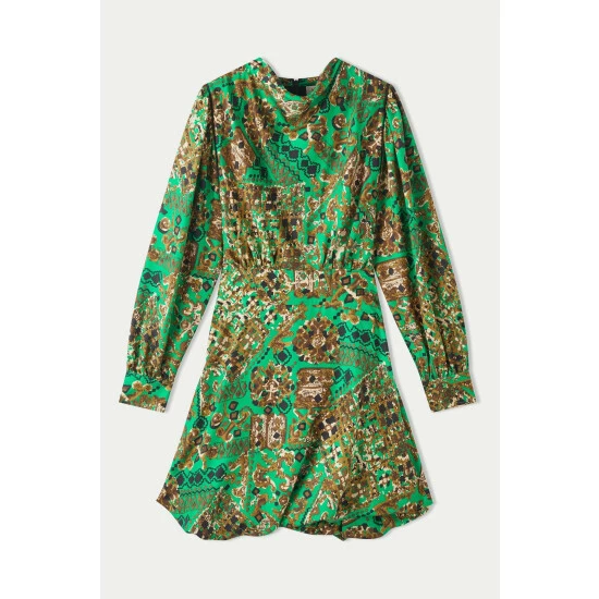 With a pattern created in house, this mini dress cut in pure silk twill is a joy to wear! Its bubble skirt silhouette is intentionally twisted at the hem to give great movement and volume. Flattering modern cowl neckline, long full sleeves with contrast black piping detail. Back neck zip. Wear with heels or a knee boot.