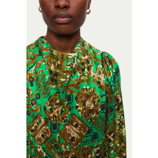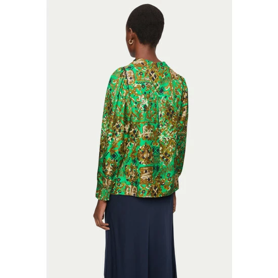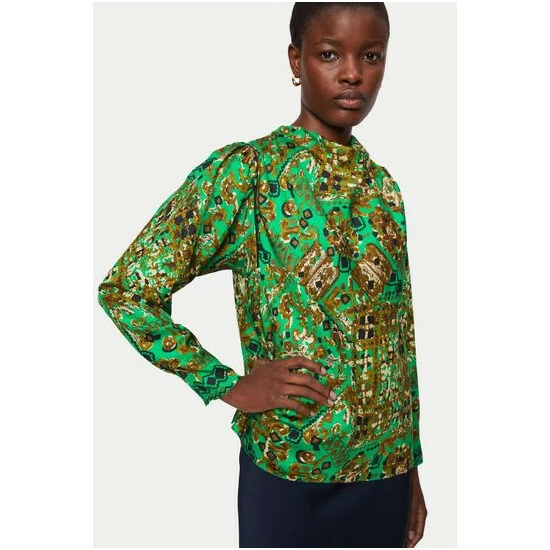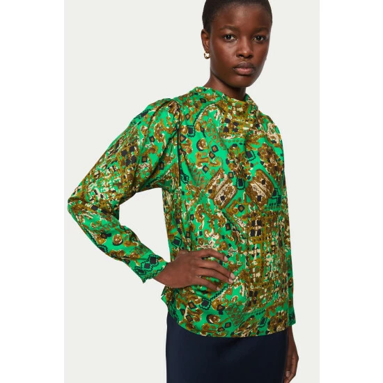 Luxe silk twill Baroque arms print, designed in house and patterned in Kew this new top is perfect with both tailored trousers or back to buttery leather separates. Feminine cowl neckline with soft gathers in the sleeve giving a lovely silhouette. Contrast piping detail outline the print beautiully. Invisible back zip fastening. Side splits.
