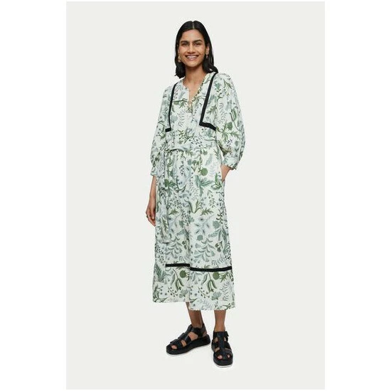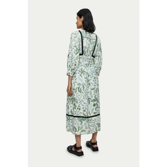 100% pure linen dress in the Jigsaw exclusive Botanist print. Medium weight linen and is a loose easy fluid pop over style. Featuring full 3/4 sleeves and optional self tie belt. Inserted black contrast trim and white gold ball buttons on neck and cuff opening.