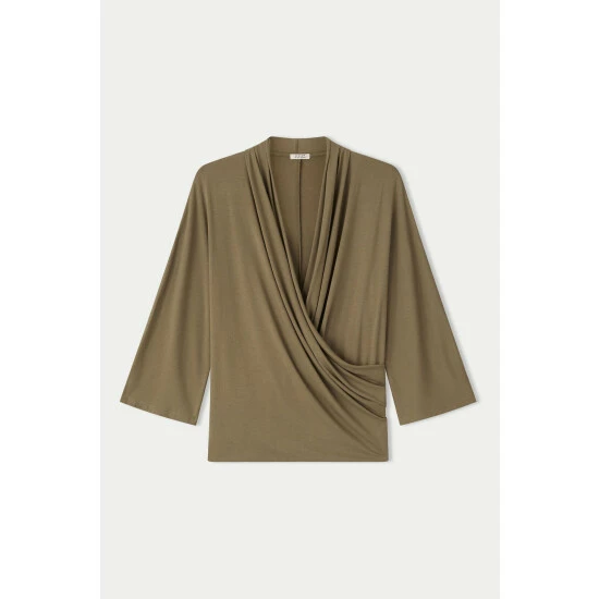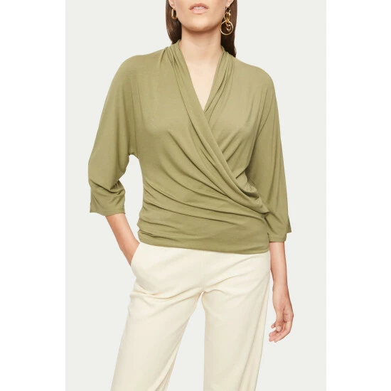 Beautiful kimono sleeve top cut from a soft viscose blend jersey. Featuring a wrap neckline with enough drape to provide ample coverage. Length to hip. Wear with jeans or style with tailored trousers and gold jewellery for a more polished look.