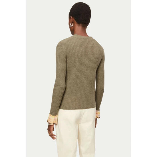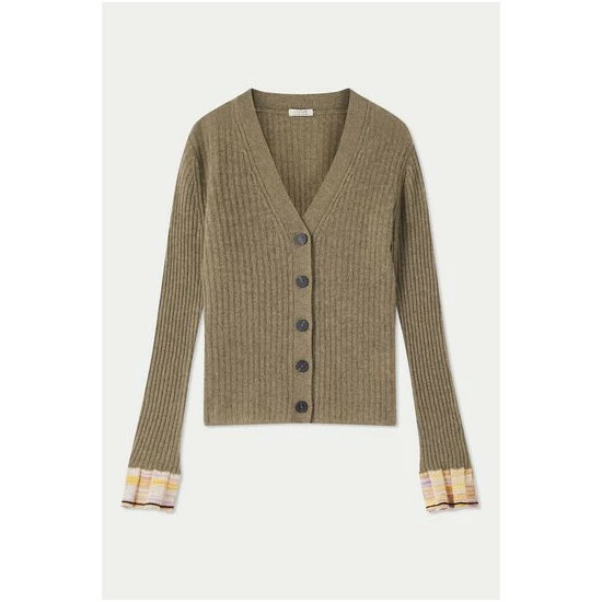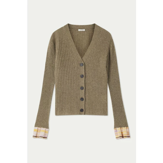 V-neck cardigan made from a luxurious merino blend with cashmere, which is beautifully soft on the skin. Semi-fitted shape knitted in a subtle rib. Featuring playful contrast cuffs knitted in a moulinee yarn.
