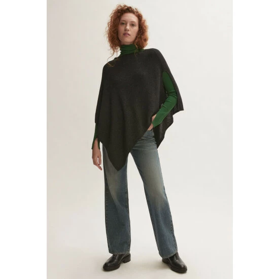 The classic poncho updated with new modern shape. Asymmetric back and front. Feminine open shoulder detail on one side. Roll edge finish on neckline. Made in Italy.