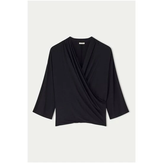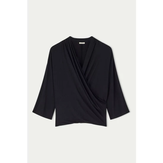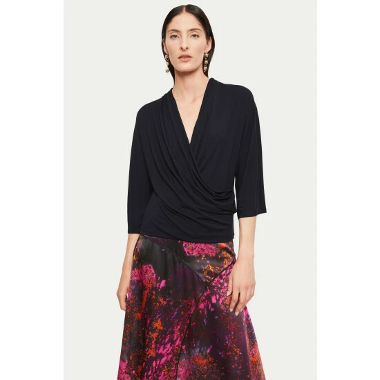 Beautiful kimono sleeve top cut from a soft viscose blend jersey. Featuring a wrap neckline with enough drape to provide ample coverage. Length to hip. Wear with jeans or style with tailored trousers and gold jewellery for a more polished look.