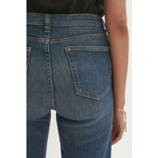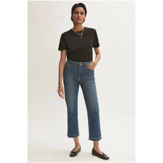 Classic mid-rise straight leg. Slim through the hips. Straight cut from hip to hem. High ankle crop length. Comfort stretch denim. Crafted in sustainable cotton, produced with recycled polyester sewing threads and zip tapes.