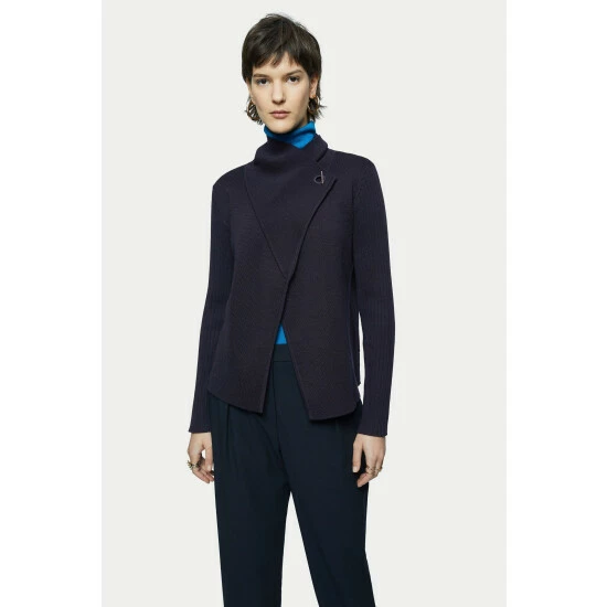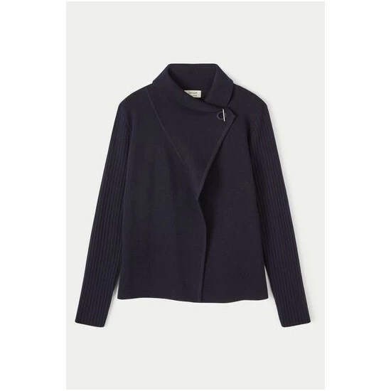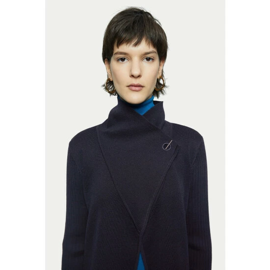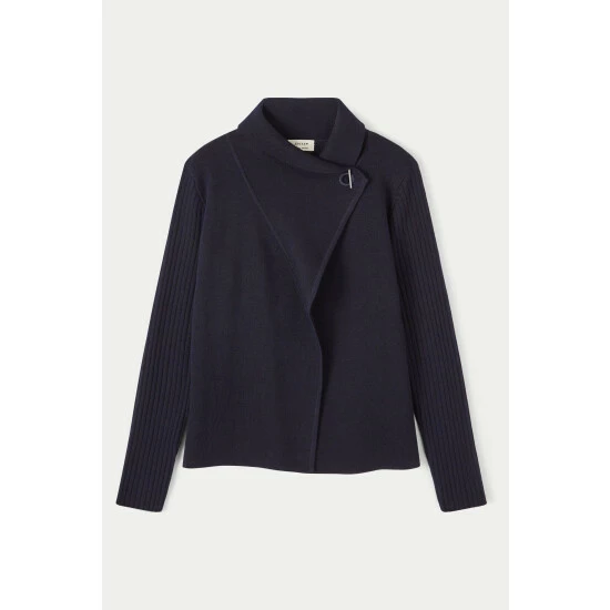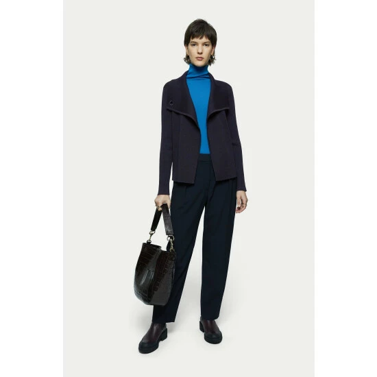 Stylish Milano knitted cardigan with softly draped collar. Featuring Jigsaw’s signature ring and bar fastening and a versatile open front design. Ribbed sleeves and back give texture. The shorter length ensures a versatile silhouette to style with high waist trousers or flowing dresses and skirts worn with chunky boots.