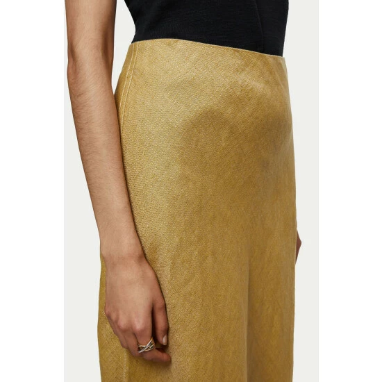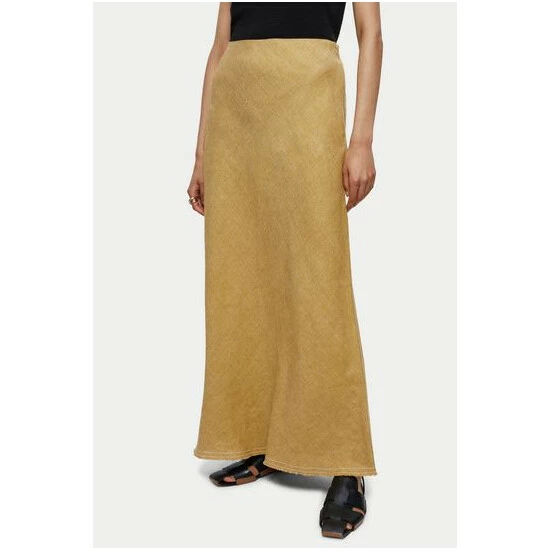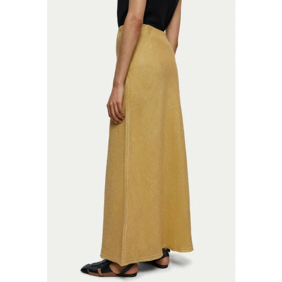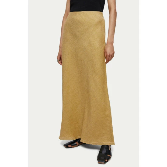 Stylish maxi skirt cut on the bias from 100% Linen with a cross dye weave. Designed with contrast twin stitch details and a raw cut hem. Features a hidden elastic waistband and invisible size zip for a comfortable fit. Style with a white t-shirt or knitted vest. This skirt is cut on the bias and has a comfy internal elasticated waist, customers may wish to size down 1 size.