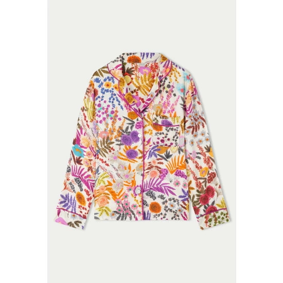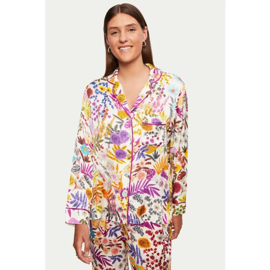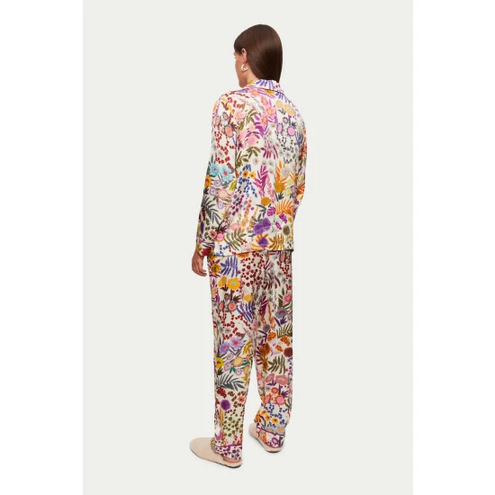 Beautiful midnight garden in-house print pyjama set with contrast piping and embossed mother of pearl buttons. Our best-selling set, cut in languid viscose satin, is the ultimate luxury. A comfortable, relaxed fit. Versatile enough to wear the shirt tucked into jeans with heels!