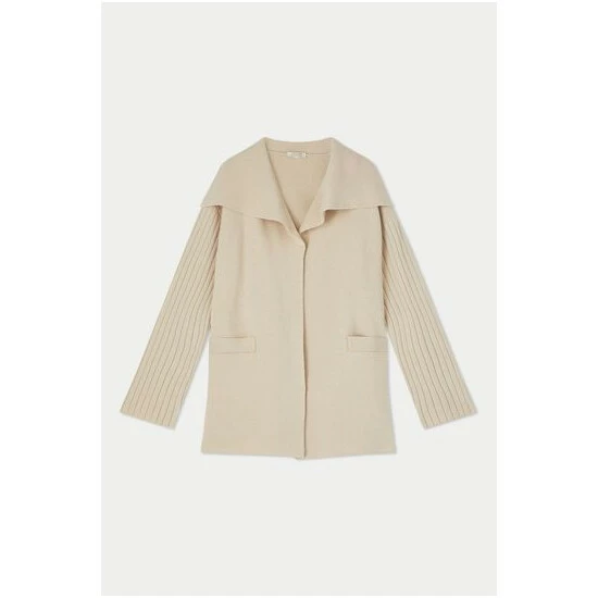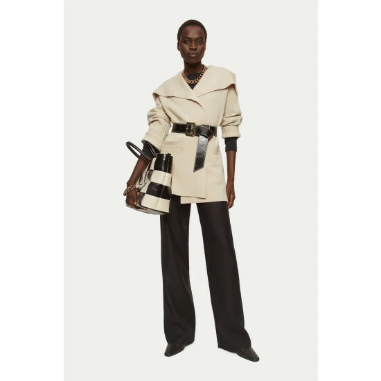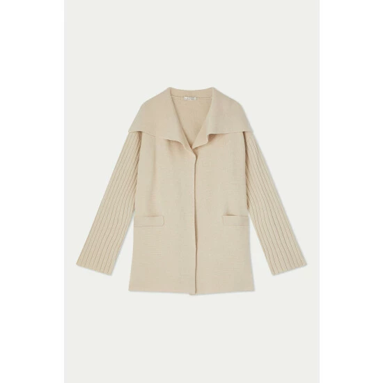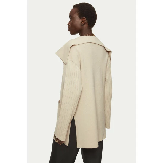 Stylish soft merino blend oversize cardigan featuring a draped collar and open front. Designed with a minimal aesthetic with clean edges and constructed in a robust Milano stitch. Perfect to layer over fine knits and dresses.