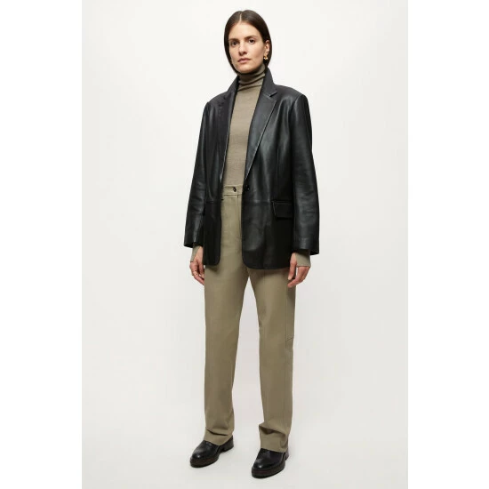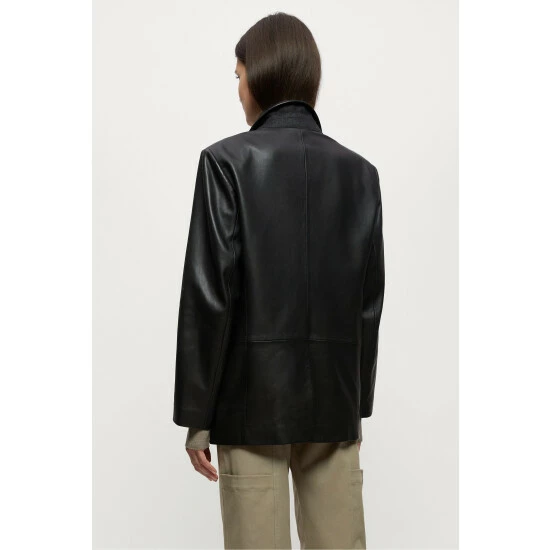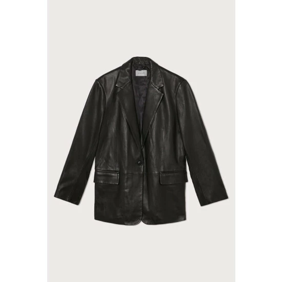 Oversized blazer cut from ethically sourced nappa leather. Featuring a single-breasted front with button closure, back vent, jet flap pockets and notch lapel. Fully lined internal with signature piping detail. A smart casual blazer perfect for light layering. Style with jeans and a T-shirt.