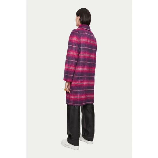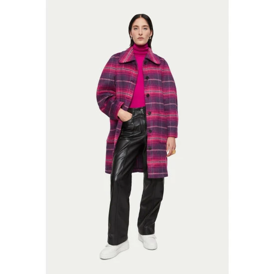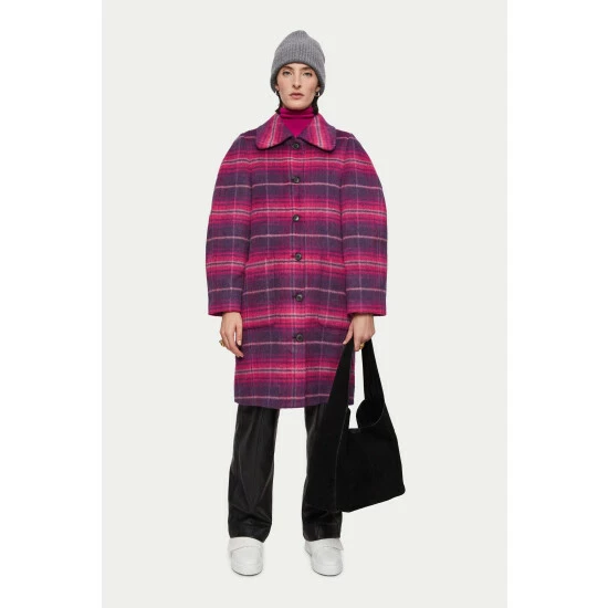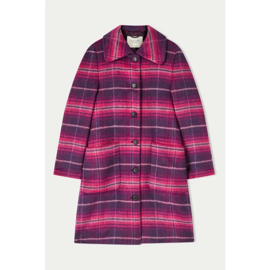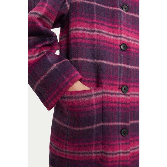 Made using a beautiful brushed wool blend fabric from Prato mill Pontetorto, who have been making the highest quality Italian fabrics for 70 years. This statement coat is a blend of rich berry tones woven into a brushed check design. Styling details include a feminine rounded collar, patch pockets and shaped, full sleeves. Buggy lined with finishing touches of contrasting horn buttons and molten undercollar. Easy fitting, enough room for chunky knitwear when winter arrives.