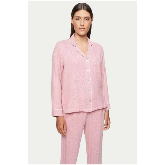 Our luxury heavy weight brushed cotton pyjama set makes a reappearance in pretty pink and grey herringbones. Contrast piping throughout and easy fitting, perfect for those days lounging at home. Elasticated waist trousers with contrast tie detail and side pockets. Mother of pearl button through shirt with top pocket.