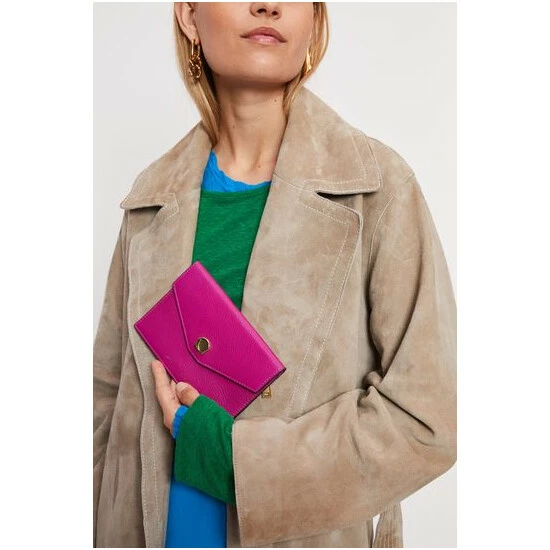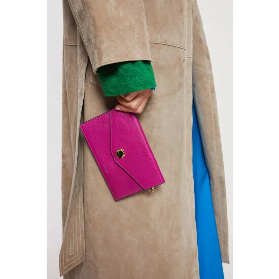 Practical envelope pouch presented in our textured pebble leather and detailed with bespoke hammered-disk fastennig. The back has a zip closure secure pocket, ideal for bank cards, coins or any other special iteams that require the added security. Interior finished with clean bonded lining in cotton-twill fabric.