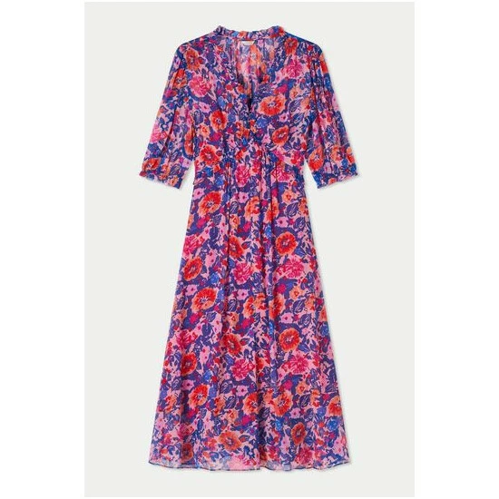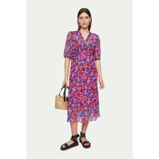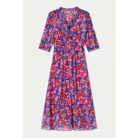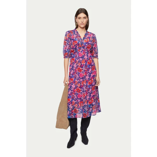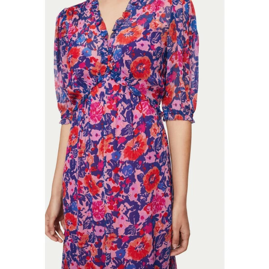 100% viscose crinkle printed georgette dress with separate lightweight viscose lining. Features a V-neckline with small ruffle detailing. A fit and flare silhouette with short sleeves and smocked cuffs.