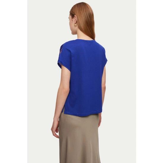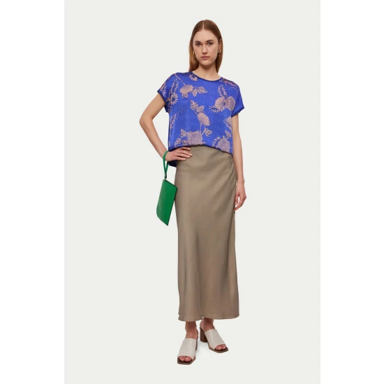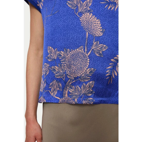 Cap sleeve T-shirt designed with a 100% silk satin printed front panel and a soft jersey panel at the back. Features a round neckline and side seam slits. A versatile addition to your wardrobe. Style it with tailored trousers or wear with jeans for a casual look.