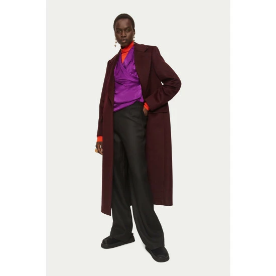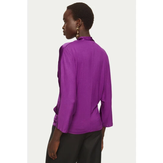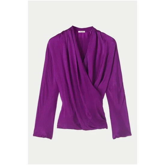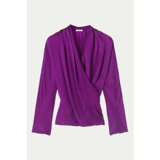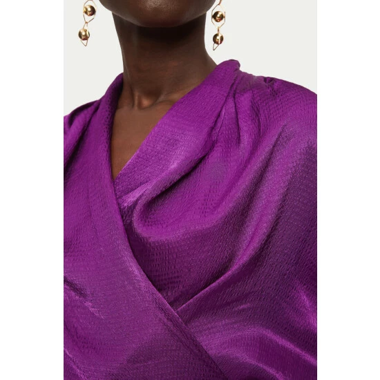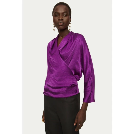 Draped wrap top cut with hammered satin panels at the front and soft drapey jersey at the back. Designed with a hidden jersey panel inside to hold the wrap in place ensuring a comfortable fit. Wear to dress up denim or layer under a tailored jacket for a flash of colour.
