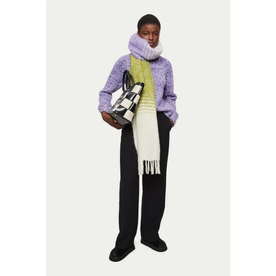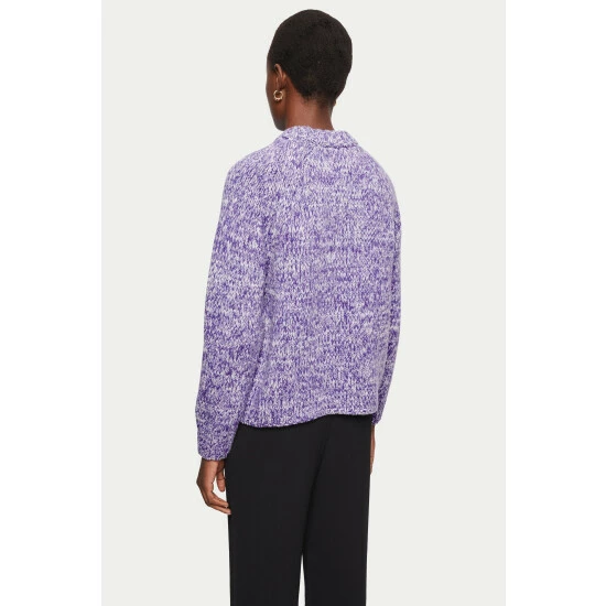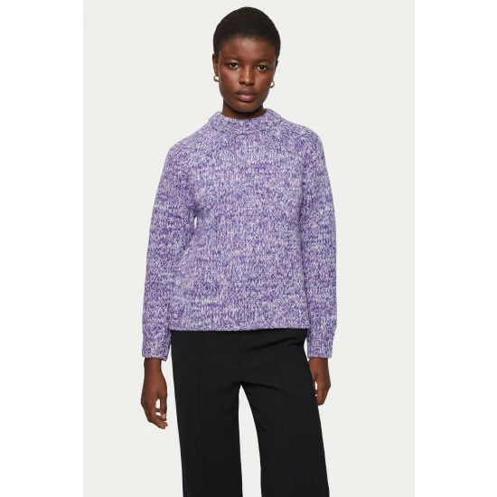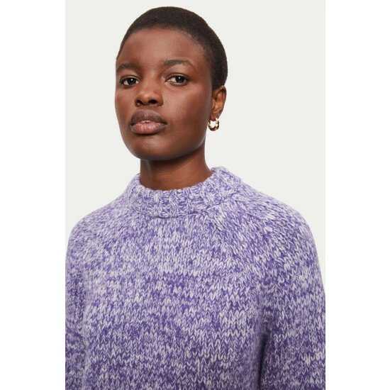 Multiple colours blended together, in this case, soft lilac and fresh white, before the yarn is spun creates this lovely moulinee knitted effect. Made in Portugal using the finest British lambswool, boxy in shape and easy fitting with a deep ribbed neck trim and raglan sleeves. Wear with leather separates or dress down with denim.