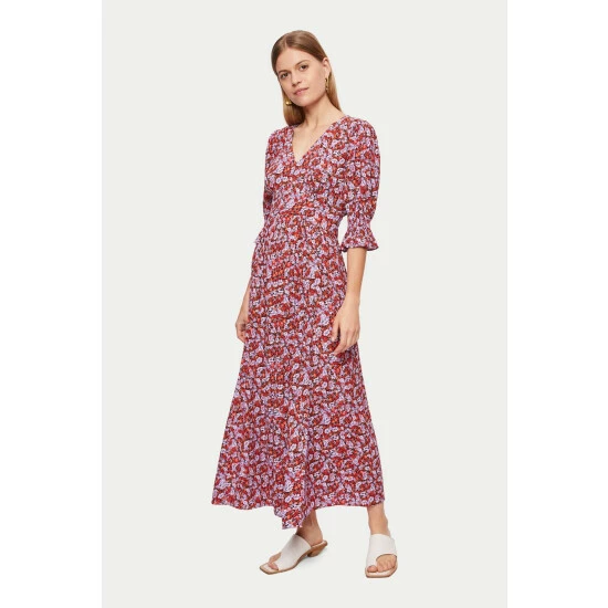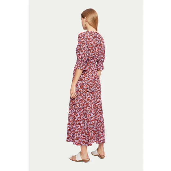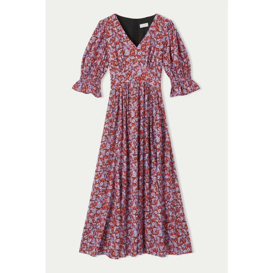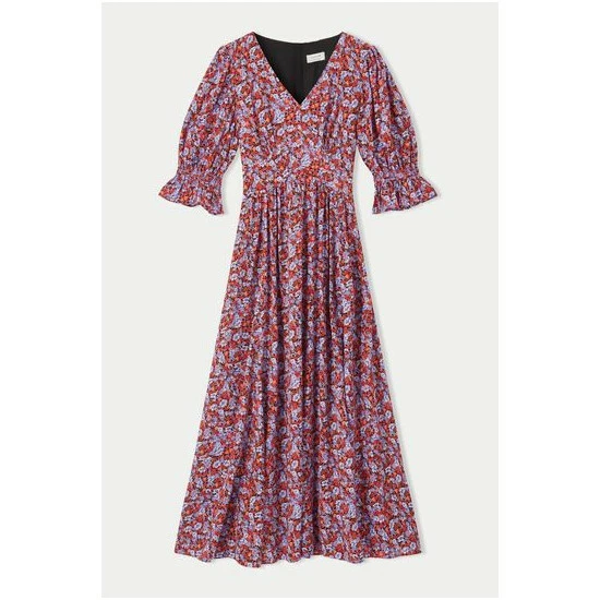 Midi length flared viscose tea dress in our pretty vintage ditsy print in vibrant clashing tones. Flattering V-neck and elbow-length sleeves with a shirring and ruffle detail. Pair with sandals and a tote.