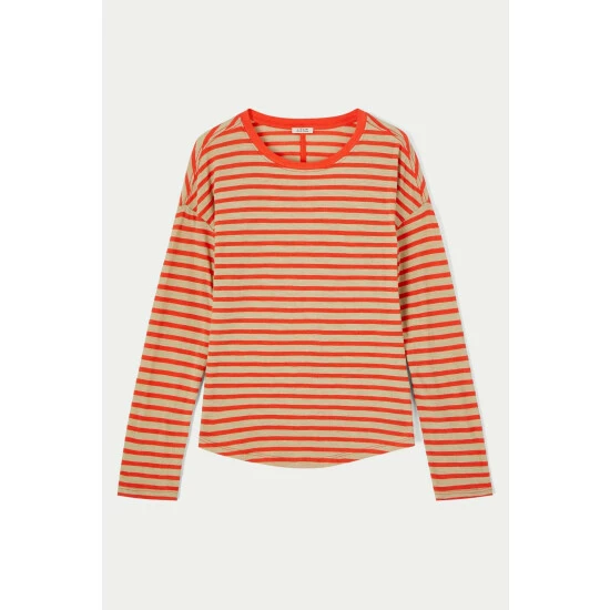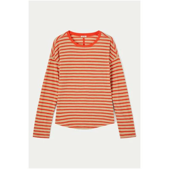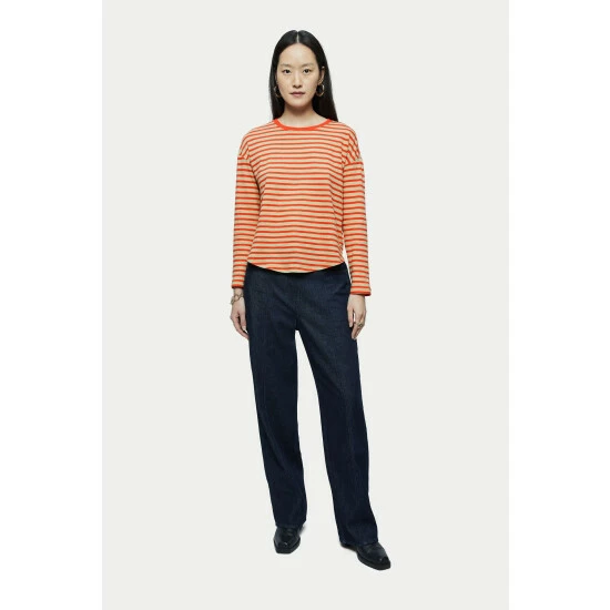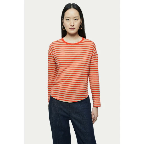 Cotton stripe boyfriend T-shirt with long sleeves. Designed in 100% cotton jersey with a subtle slub. The centre back is detailed with their signature seam and the hem has a scooped shape reminiscent of a man s shirt. Wear with jeans at the weekend or to lend a casual feel under tailoring.