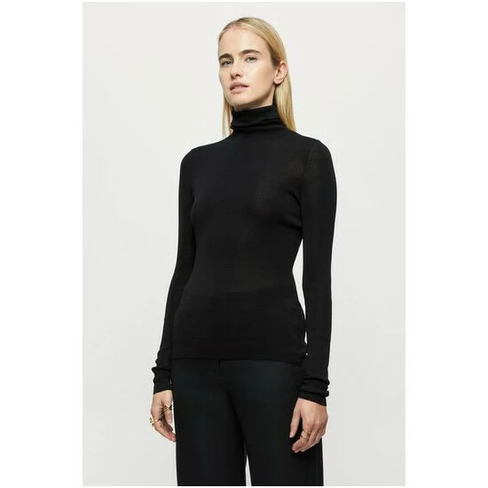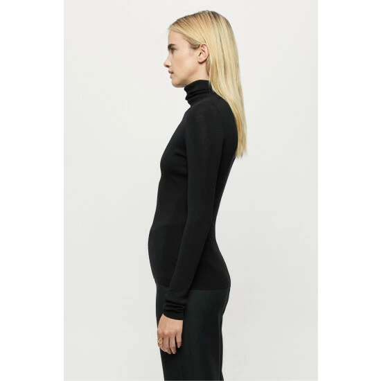 Fine knit silk cotton polo neck jumper with long slim sleeves and flattering form fitting body. A luxurious silk rich yarn which feels soft against the skin. This lightweight jumper will prove indispensable in your wardrobe for layering under dresses and jackets for day or tucked into high waisted trousers for evening.