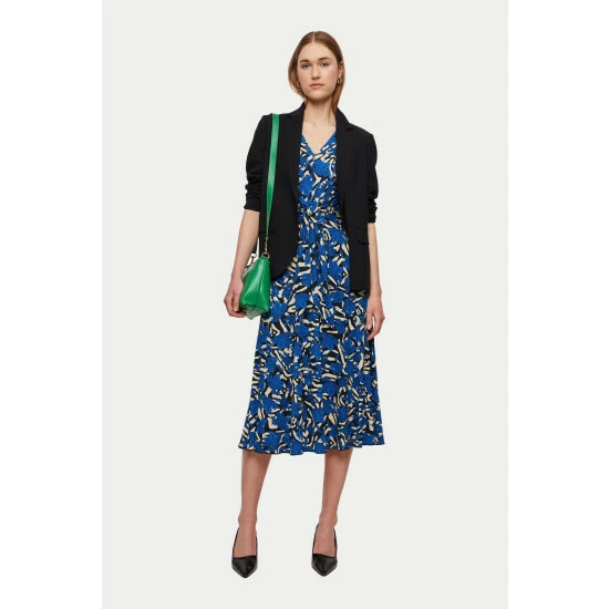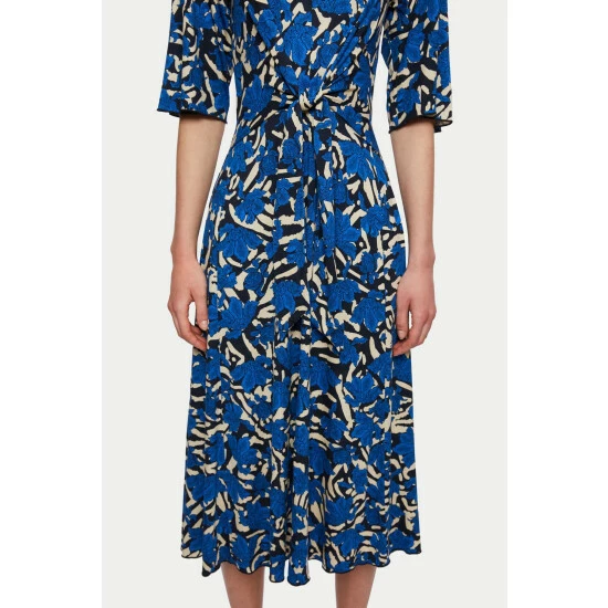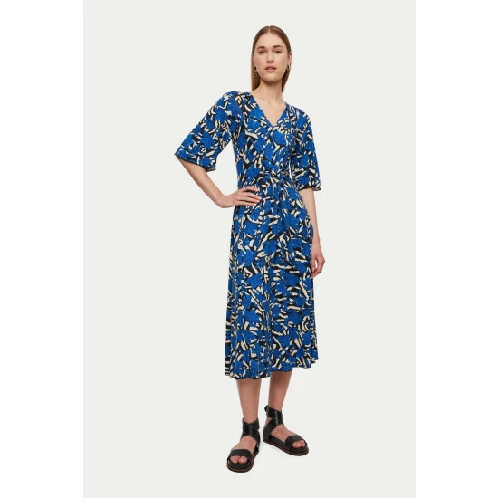 Beautiful drapey stretch viscose jersey dress. Designed with a flattering v-neckline, slightly fitted through the waist and flaring out to a flowy midi length skirt. Featuring a tie detail at the front waist to ensure a perfect fit every time. The waisted silhouette is emphasied by the volume of the wide drapey sleeves. This dress is cut in our striking Zebra Floral print, perfect for a relaxed daytime look or dressed up for the evening with your favourite gold jewellery.